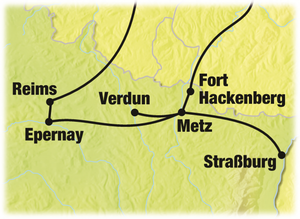 Heute entdecken Sie Metz bei einem geführten Stadtrundgang. Die gotische Kathedrale Saint-Étienne mit ihren farbenprächtigen Glasfenstern – darunter eindrucksvolle Werke von Marc Chagall – zählt zu den schönsten Frankreichs und prägt das Stadtbild bis heute. Anschließend bummeln Sie durch die historische Altstadt mit ihren eleganten Fassaden sowie durch das deutsche Viertel, dessen imposanter Bahnhof aus dem Jahr 1906 als architektonisches Highlight gilt. Zum Abschluss besuchen Sie die Markthallen von Metz. Hier verkosten Sie typische Wurst- und Käsespezialitäten, begleitet von einem Glas Wein, und erleben die kulinarische Vielfalt Lothringens. Der Nachmittag steht Ihnen zur freien Verfügung – vielleicht für einen Spaziergang zum romantischen Temple Neuf im „Jardin d’Amour“.